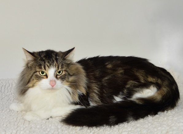 Meet JOEY! Joey is a handsome black, brown, and white tabby with a beautiful coat and a heart to match. Around 6 years old, he has