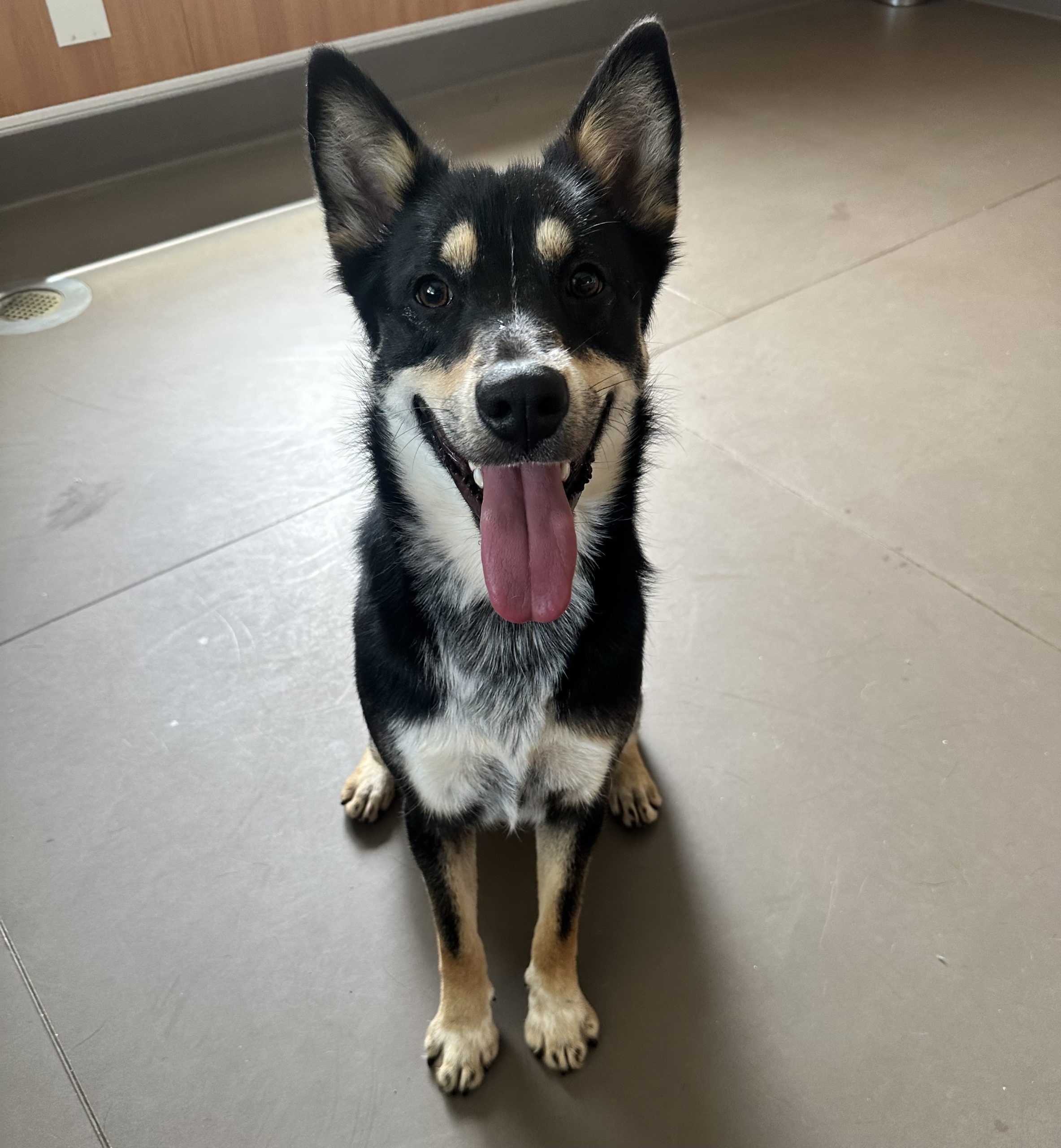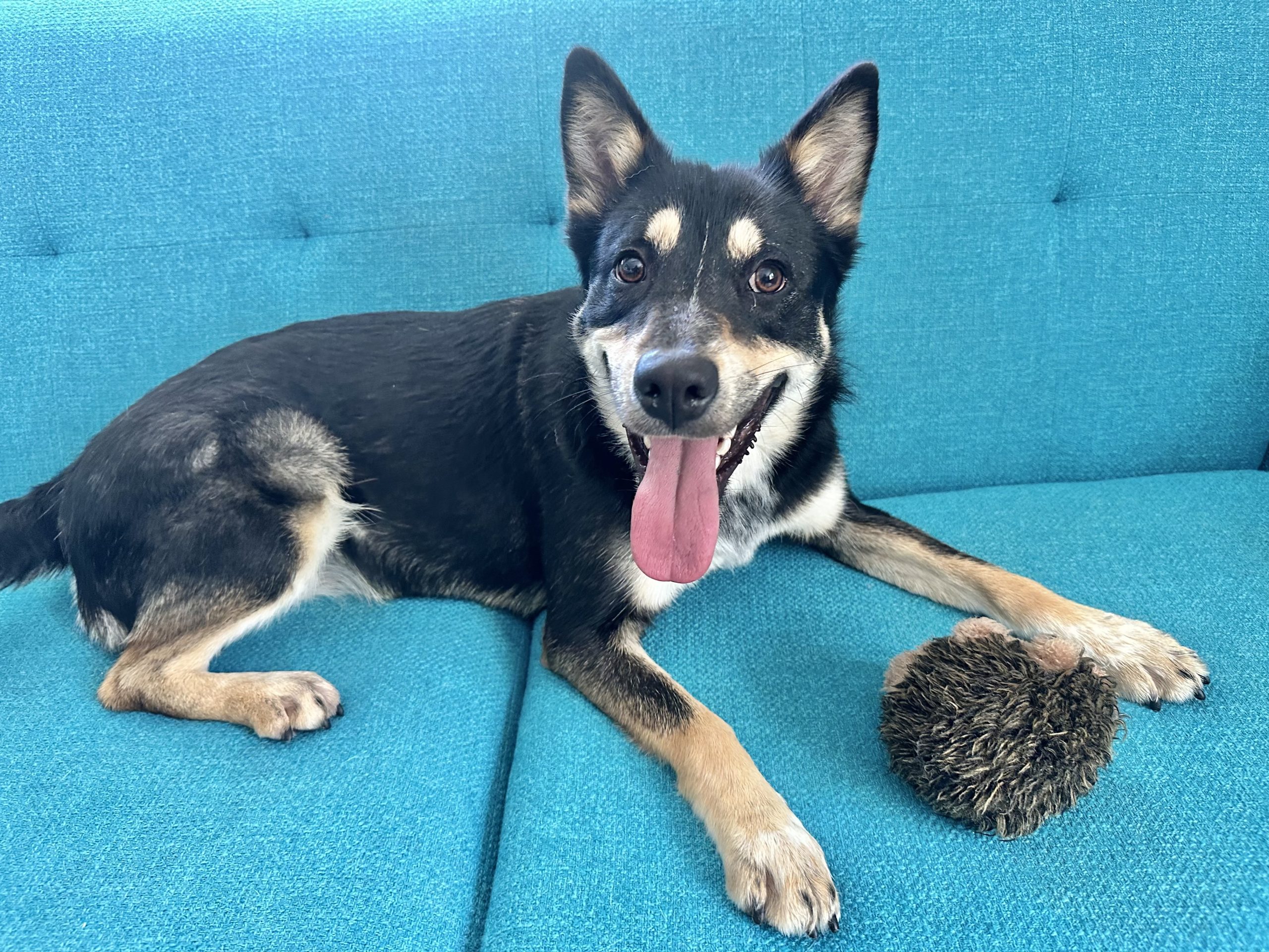 This 35-pound sweetheart, about a year and a half old, is energetic and playful, although at first she turned up her nose at every single toy we offered her. Until, that is, she saw the plush squeaky hedgehog. They are now a mandatory dual adoption. (Translation: We’re sending Mr. Hedgehog home with her, because they are A Thing.)