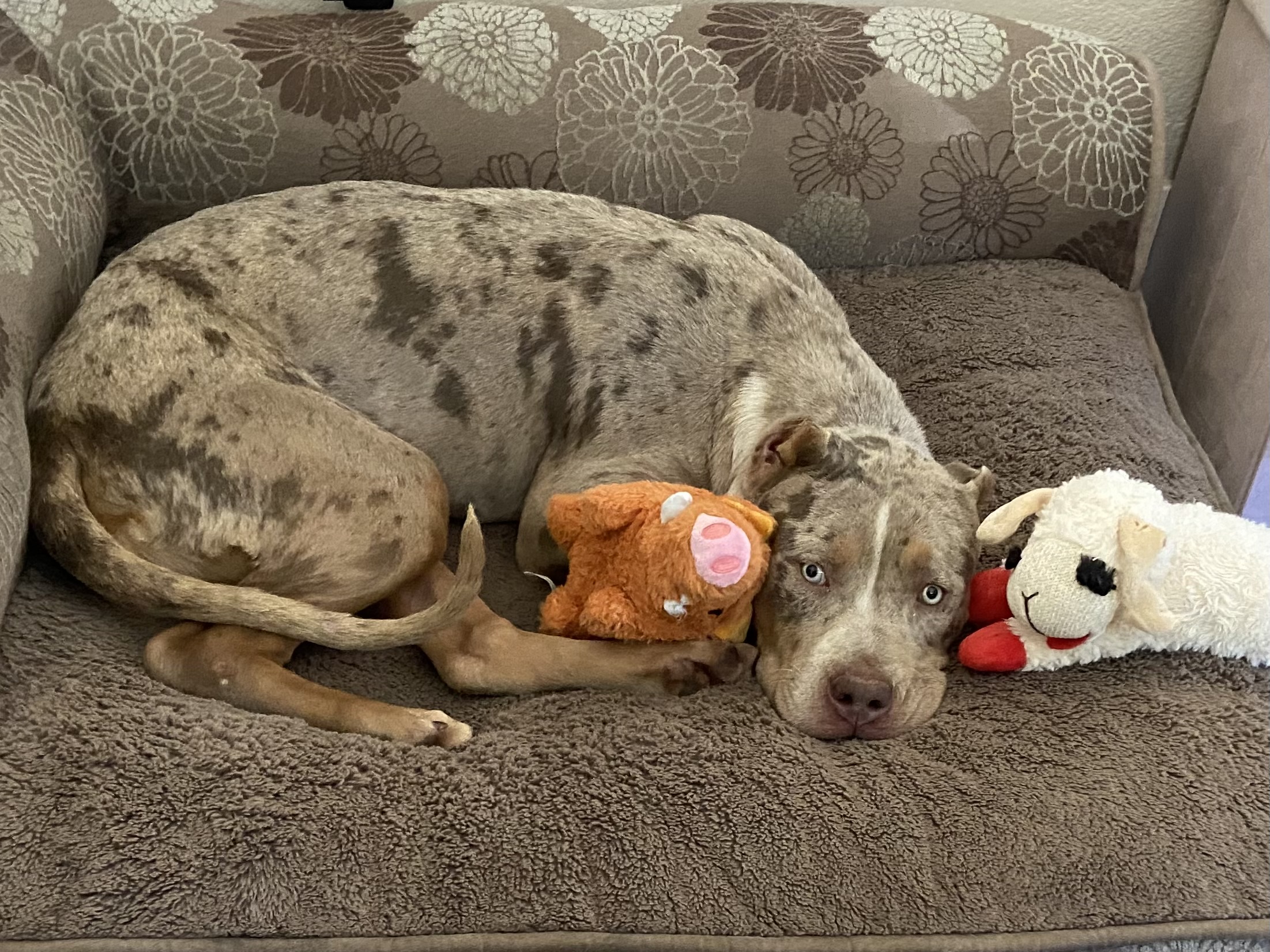 Starling was extremely shy and had shut down, completely overwhelmed by her life and surroundings. When we took her in, she slept for four days straight, waking only to eat and potty, as she recovered emotionally.