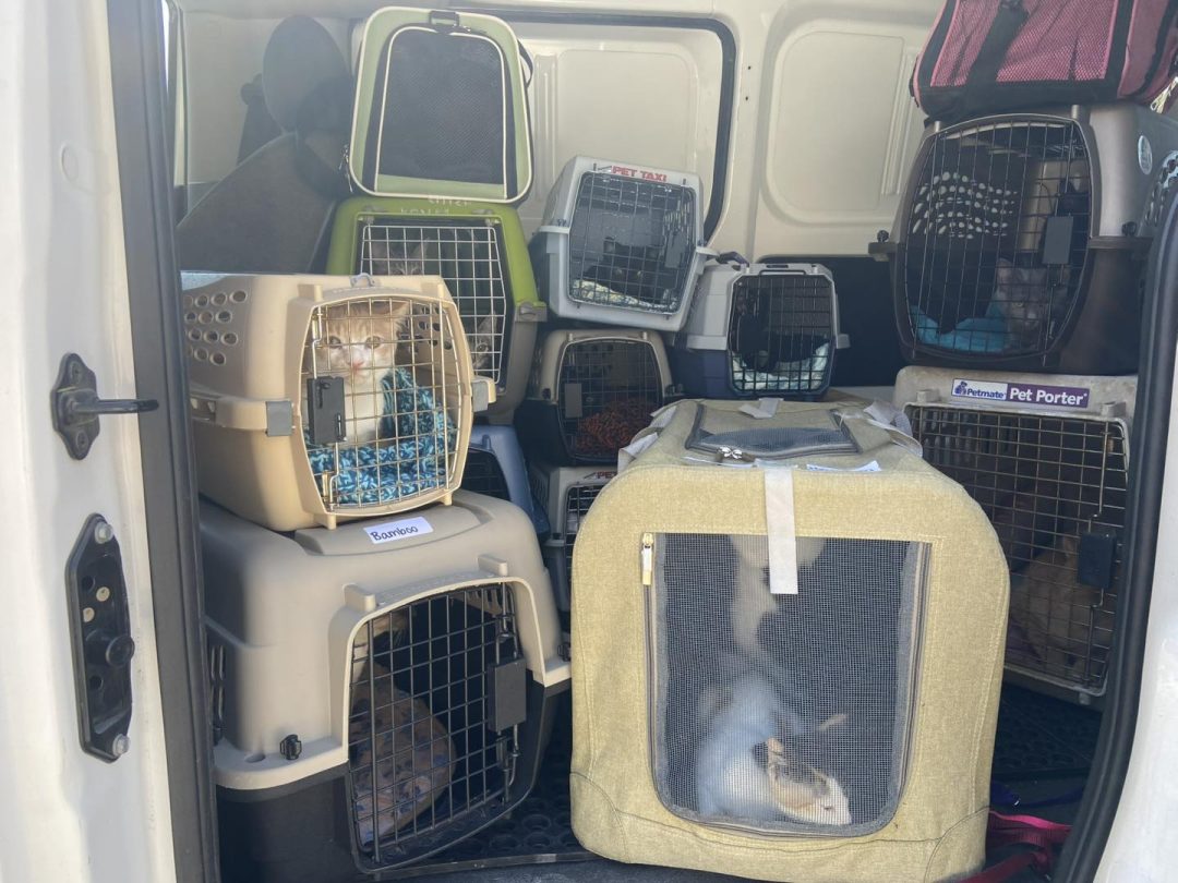 What’s this? Why, it’s our van filled with NINETEEN of our kittens and cats about to head back to our shelter after being spayed and neutered Friday at Jackson Creek Veterinary Clinic. We’re so grateful when we can knock out so many of ’em at once. Thanks, Jackson Creek!