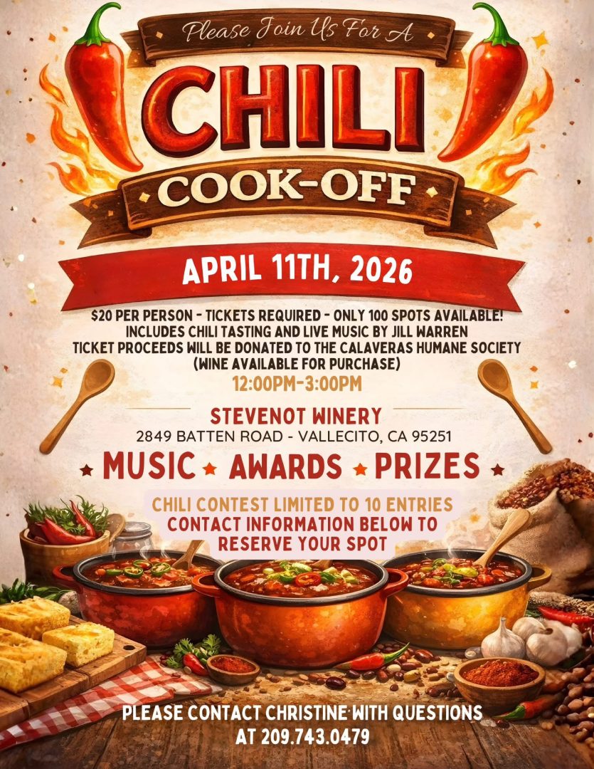You do NOT want to miss this! Our friends at Stevenot Winery & Tasting Room are having their first ever Chili Cook-Off, and they’re donating the ticket proceeds to us to help the animals in our care. Enjoy chili tasting, music by the one and only Jill Warren, delicious wine, and more, all in a […]